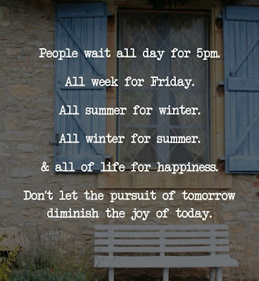 I posted this on my Facebook page yesterday. It resonated with me. I have often been guilty of this habit. When it is hot and sticky in the summer months, I am longing for cool crisp autumn days. When I have an appointment, or a test, or some such, I am guilty of wanting it to be done and dusted. I forget to live in the moment at times. I know that we do need to protect our futures, plan for rainy days, etc. but at the same time we need to remember to hold our todays in the palms of our hands as well and treasure them for the gifts that they are.